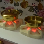 Zwei Kochfelder leuchten rot auf und erzeugen zusammen mit den drehbaren Knöpfen Effekte von Kochen und Braten – ein perfektes Kochspiel-Erlebnis.