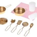 Im Lieferumfang enthalten ist ein Set an Geschirr und Zubehör, damit das Spiel sofort beginnen kann: Metalltopf und Stielkasserolle mit Deckel, Schöpflöffel, Schaumlöffel, Pfannenwender, Pasta-Zange, Plastikbecher, Schwamm und rosa Tuch. Unterschränke und Regale bieten viel Platz zur Aufbewahrung von Lebensmitteln und Zubehör.