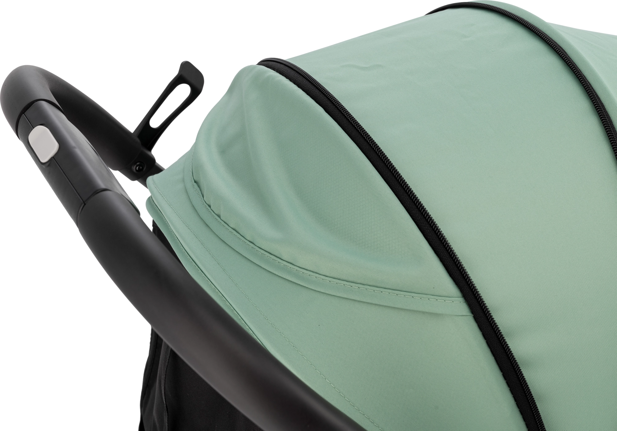 Das verstellbare Verdeck mit Sichtfenster schützt vor Sonne und Wind, während das Mesh in der Rückenlehne für eine bessere Luftzirkulation sorgt.