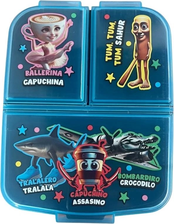 Bewahren Sie Snacks übersichtlich und frisch auf. Diese robuste Multi-Box mit dem Motiv Italian Brainrot bietet eine smarte Aufteilung: ein geräumiges Fach für Sandwiches und zwei kleinere für Obst, Gemüse oder kleine Leckereien. Dank solider Verarbeitung hält sie dem täglichen Gebrauch und gelegentlichen Stürzen stand.