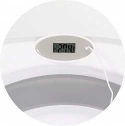 Das integrierte Thermometer hilft, die ideale Wassertemperatur einzustellen. Die Ablassöffnung mit praktischem Stöpsel beschleunigt das Entleeren ohne Anheben der Wanne.