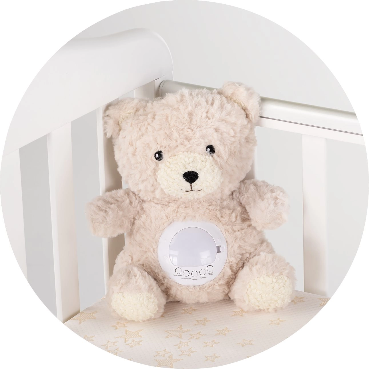 Der Teddybär bietet drei Projektionskappen – Sternenhimmel, Ozean und Nachtlämpchen – sodass Sie leicht die ideale visuelle Begleitung für Abendrituale wählen. Das Aufladen über USB Type‑C ist modern und bequem, ganz ohne ständigen Batteriewechsel.