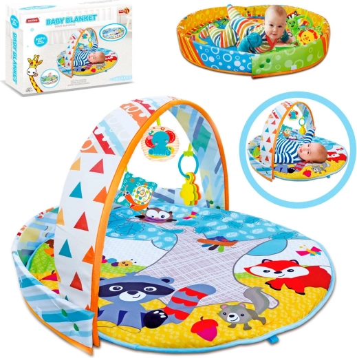 Enthalten sind weiche Plüschkissen, ein Beißring, Rasseln und Raschelelemente, die Hören, Sehen und Tastsinn stimulieren. Die Decke ist ideal für Tummy Time (Spielen in Bauchlage) und entspanntes Beobachten in Rückenlage. Dank der einfachen Faltbarkeit lässt sie sich leicht transportieren oder verstauen.