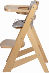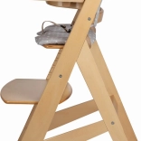 Das abnehmbare Tablett und der hölzerne Sicherheitsbügel ermöglichen einen einfachen Wechsel vom Hochstuhl zum Stuhl am Tisch. Der integrierte 3-Punkt-Gurt und die bequeme Polsterung erhöhen Sicherheit und Komfort auch bei längerem Sitzen.