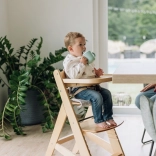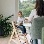 Das Tablett mit Becheraussparung sowie der Holz-Sicherheitsbügel lassen sich leicht abnehmen, sodass das Kind später direkt mit der Familie am Tisch sitzen kann.