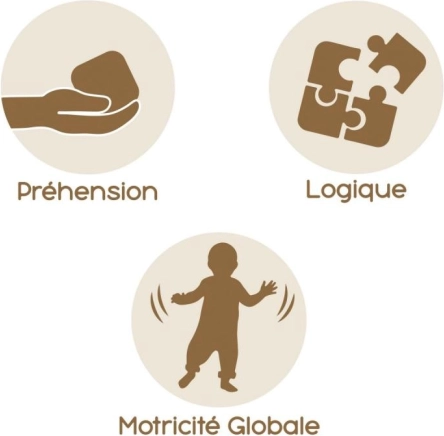 Kinder lieben die farbenfrohen Elemente: Perlenlabyrinth, drehbare Zahnräder, Kugelturm und Formensteckspiel. Jede Aktivität ist darauf ausgelegt, motorische Entwicklung, Geduld sowie das Verständnis von Ursache und Wirkung zu fördern.