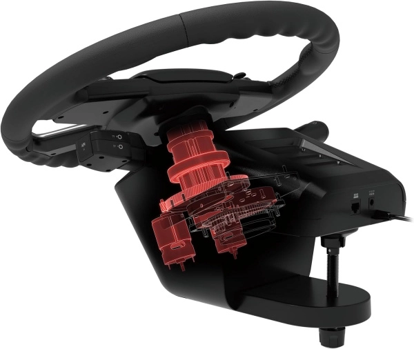 • Realistisches 40‑cm‑Lenkrad mit Kunstlederbezug und 1800° Drehung