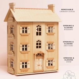 Dieses hohe Puppenhaus aus zertifiziertem FSC-Holz ist so gestaltet, dass es zu langanhaltendem und kreativem Spiel inspiriert. Dank präziser Details und voll funktionsfähiger Elemente – öffnenden Fenstern, Fensterläden und Türen – erschaffen Kinder mühelos eigene Geschichten und eine Fantasiewelt, die sie über viele Jahre teilen können.
