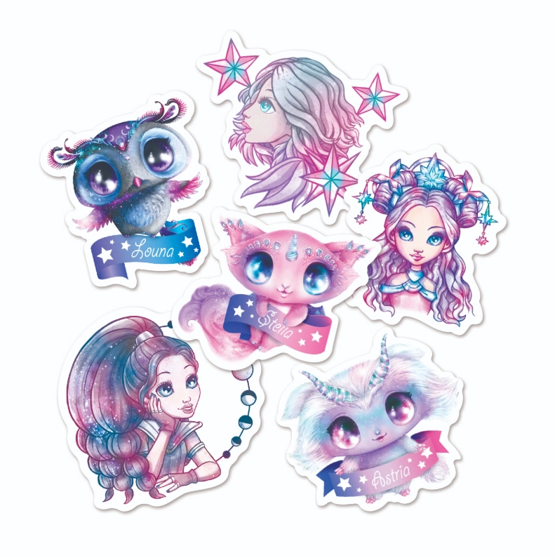 Verleihen Sie Ihren Sachen mit den originellen NEBULOUS STARS Motiven mehr Glanz. Die langlebigen Vinyl-Aufkleber haben eine glänzende Oberfläche, präzise Konturschnitte und wunderschöne Illustrationen von Mädchen und niedlichen Tieren mit Star- & Fantasy-Elementen. Dank der Wasserfestigkeit haften sie auf Trinkflaschen, Planern und Elektronik und halten normaler Feuchtigkeit stand.