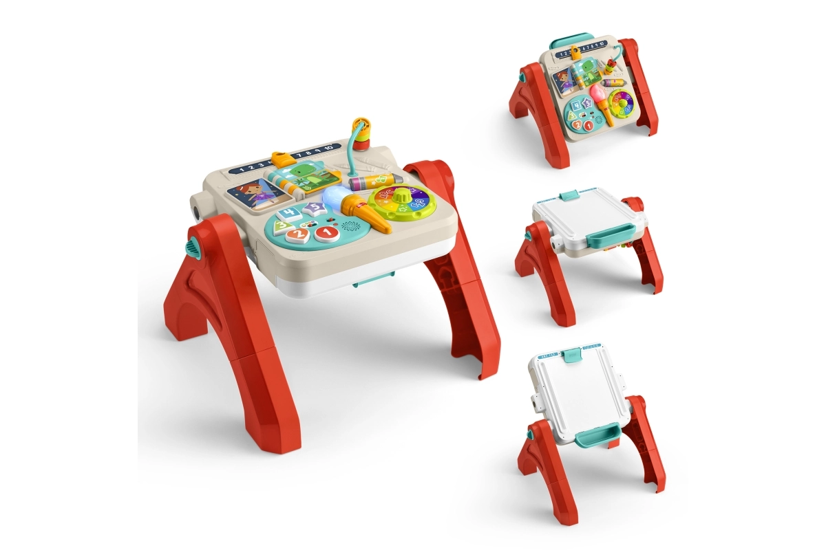 Der Tisch kann in vier Modi verwendet werden: für sitzende Babys, als Aktivitätstisch für stehende Kinder, als offener Tisch für Spiele und Kreativität sowie als stehende Staffelei. Die Staffelei bietet eine Papierklemme, einen Behälter für Kreativmaterial und seitliche Aussparungen für Stifte und Buntstifte – alles für komfortables und sauberes Gestalten.