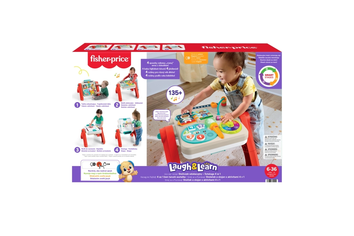 Der interaktive FISHER-PRICE 4-in-1-Spieltisch bringt cleveres Lernen durch Spiel in jeder Entwicklungsphase. Kinder begeistern eine „Künstler“-Palette mit Zahlen-, Farben- und Formenlernen, ein drehbares Farbrad mit Musik, ein drehbares Büchlein, eine Perlenleiste sowie ein Spinner zur Förderung der Feinmotorik. Die Smart Stages-Modi lassen sich leicht an Alter und Fortschritt des Kindes anpassen.