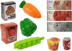 Im Set enthalten sind ein Einkaufskorb und eine Auswahl an Lebensmitteln, wodurch Kinder leicht in die Rolle von Verkäufer und Kunde schlüpfen und soziale Fähigkeiten entwickeln.