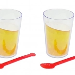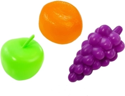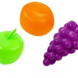 Mit dabei sind Trauben, Apfel und Orange, zwei Becher mit Löffeln sowie eine Eiswürfelform für realistische Smoothie-Szenarien.