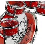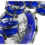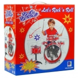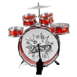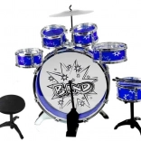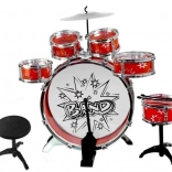 Das Set umfasst eine große Bassdrum mit Pedal, eine Stand-Snare, ein mittleres Tom, drei kleine Toms, ein Becken und einen bequemen Hocker zum Sitzen. Dank der kompakten Maße passt es ins Kinderzimmer und motiviert zu musikalischer Entwicklung, Kreativität und zur Koordination von Händen und Füßen.