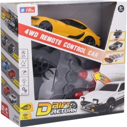 Im Lieferumfang enthalten sind 4 Standardräder und 4 Drifträder, sodass Sie mühelos zwischen griffigem Fahren und spektakulären Slides wechseln können. Lichteffekte sorgen für eine attraktive Optik, und Pylonen helfen beim Präzisionstraining. Die Stromversorgung übernimmt ein 3,7 V 500 mAh Akkupack mit bis zu 20 Minuten Laufzeit und etwa 80 Minuten Ladezeit über das mitgelieferte USB-Kabel.