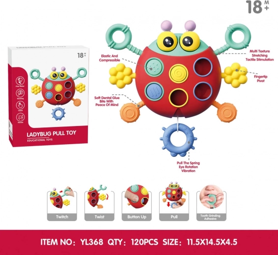 Dieser sensorische Marienkäfer besteht aus hochwertigen, sicheren Materialien und begeistert Kinder mit Kontrastfarben und vielfältigen Aktivitäten. Erhabene Elemente mit unterschiedlichen Beiß-Texturen beruhigen das Zahnfleisch und fördern die Sinneswahrnehmung. Das Schieben, Ziehen und Drehen der Elemente entwickelt auf natürliche Weise die Feinmotorik und die Hand-Auge-Koordination.