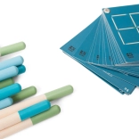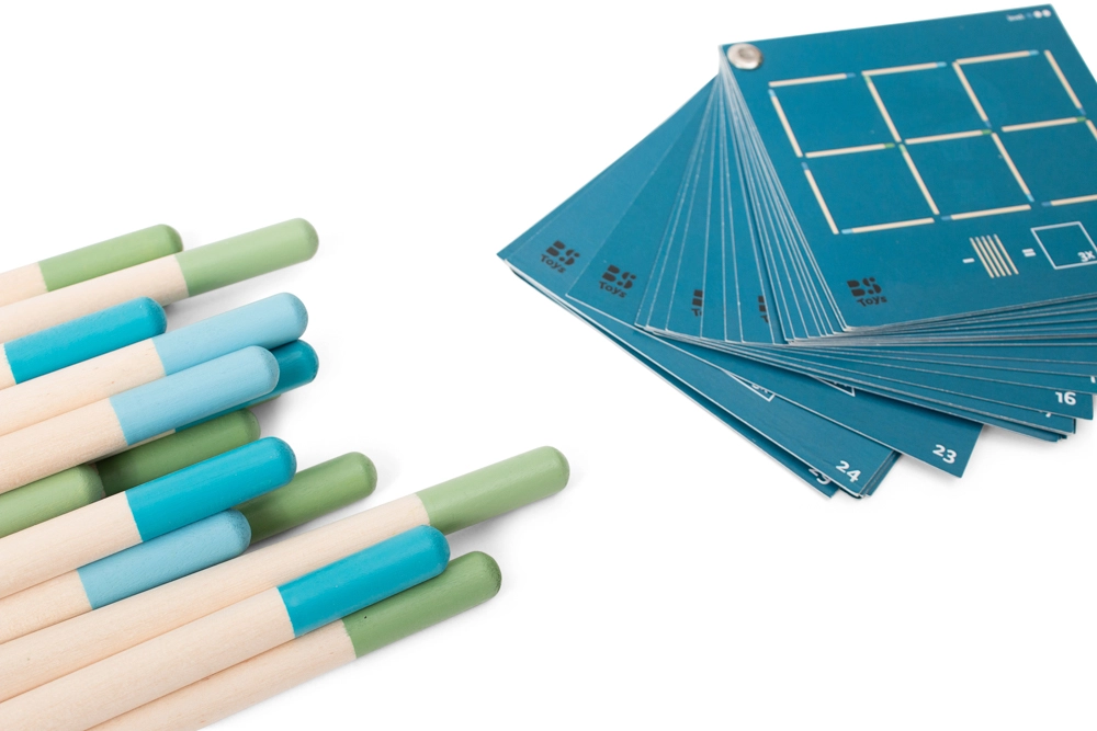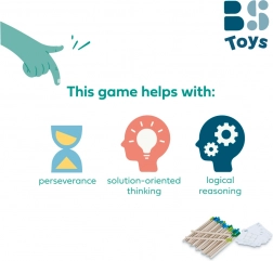 Packungsinhalt: 24 Holzstäbchen mit farbigen Enden (21 × 0,9 cm), 30 Aufgabenkarten und ein Stoffbeutel zur einfachen Aufbewahrung. Das Spiel unterstützt Ausdauer, lösungsorientiertes Denken und logisches Schlussfolgern.