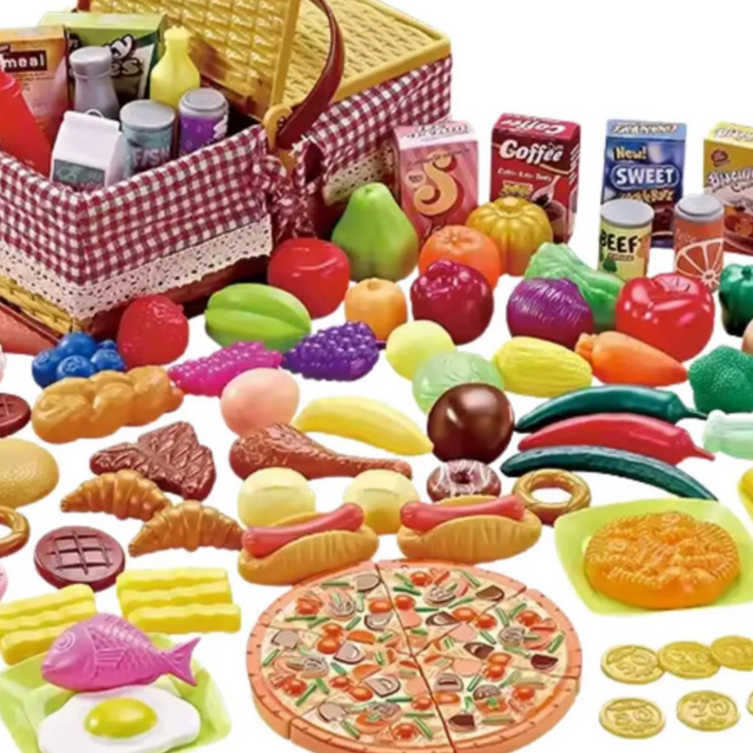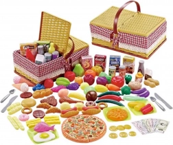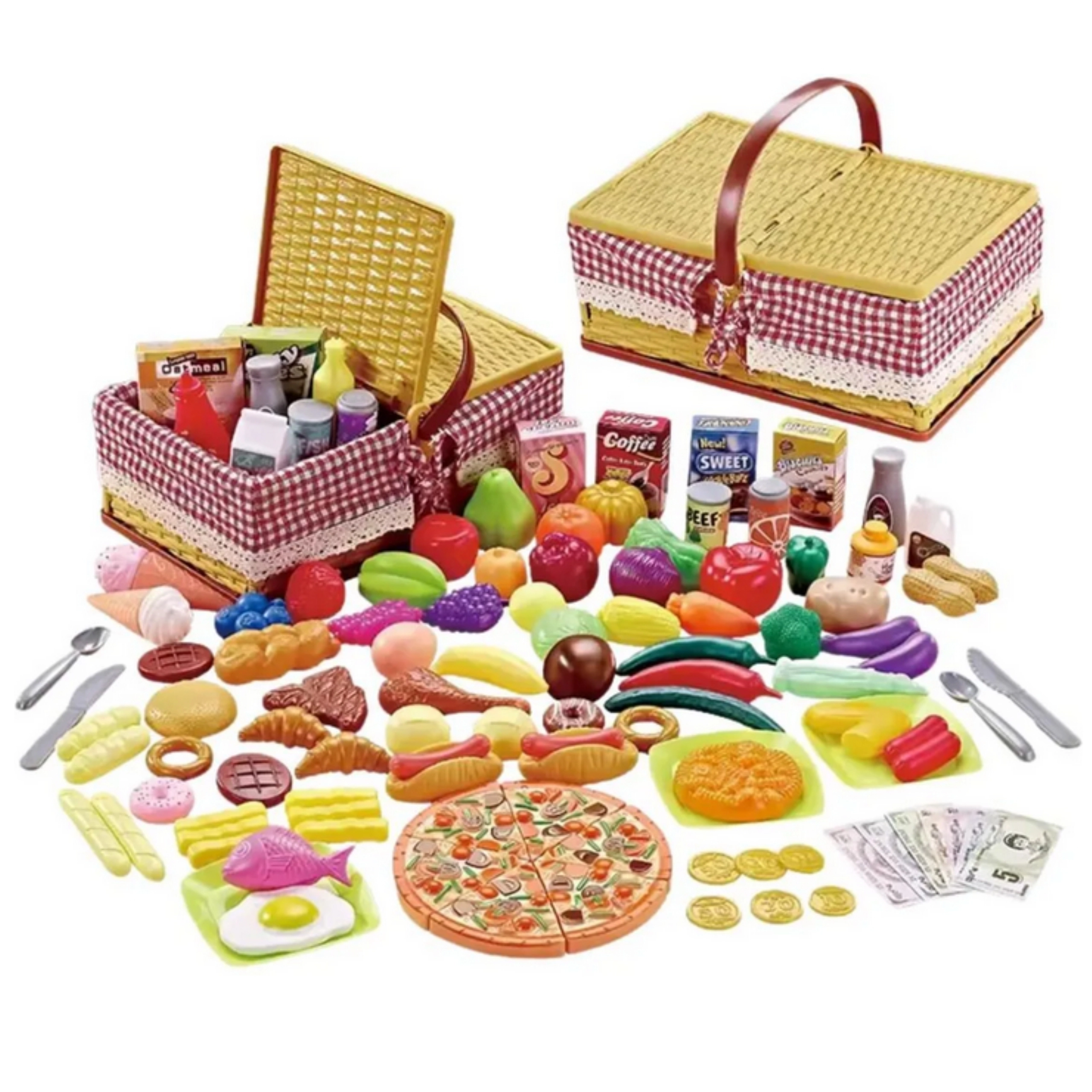 Im Set findest du eine bunte Auswahl an Lebensmitteln und Zubehör – von in Stücke teilbarer Pizza über Obst und Gemüse bis hin zu Desserts, Getränken und Besteck. Es fehlen auch nicht Scheine und Münzen für das Laden-Spiel, die logisches Denken und Zählen fördern.