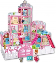 Zusammenbaubares Haus, Puppe, Hundefigur, Möbel und Zubehör, Garten mit Zaun und Tor, Treppen, Rutsche