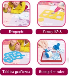 Dank der großen Fläche von 98 × 78 cm können sich ein oder mehrere Kinder bequem austoben. Die Unterlage lässt sich leicht zusammenfalten – praktisch zu Hause und auf Reisen. Im Set enthalten sind außerdem Schablonen, Stempel und farbige Förmchen, die die Möglichkeiten des kreativen Gestaltens erweitern und das Erkennen von Farben und Formen fördern.
