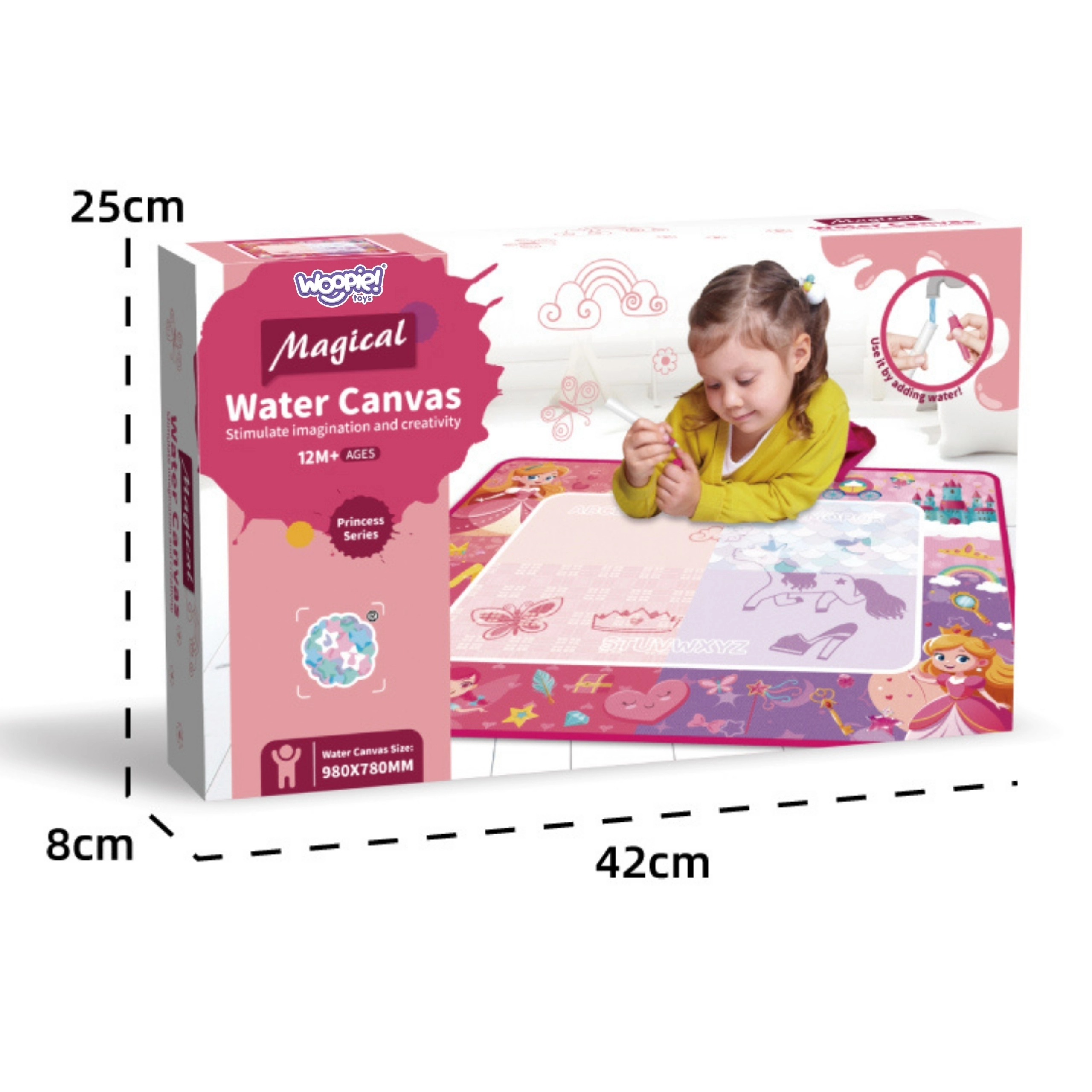Die WOOPIE Wasser-Malunterlage ist die ideale Wahl für Eltern, die sauberen und sicheren Spaß ohne Farben und Flecken suchen. Einfach die Wasserstifte befüllen und losmalen – die farbigen Motive verschwinden nach dem Trocknen, sodass die Unterlage immer wieder verwendbar ist. Das Prinzessinnenmotiv regt die Fantasie an und schafft eine inspirierende Umgebung für spielerisches Lernen.