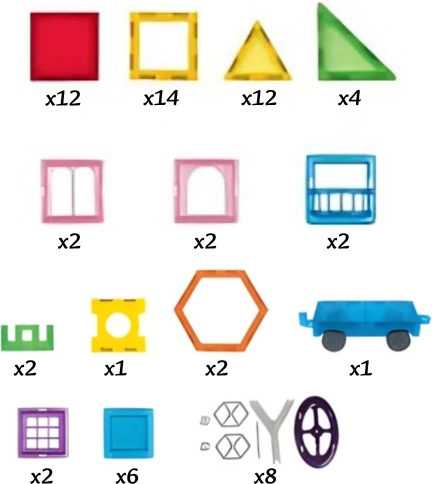 Das Set umfasst Quadrate, Dreiecke und Spezialelemente in leuchtenden Farben. Kinder können 2D-Muster und 3D-Bauten erstellen und so ihr räumliches Vorstellungsvermögen entwickeln.