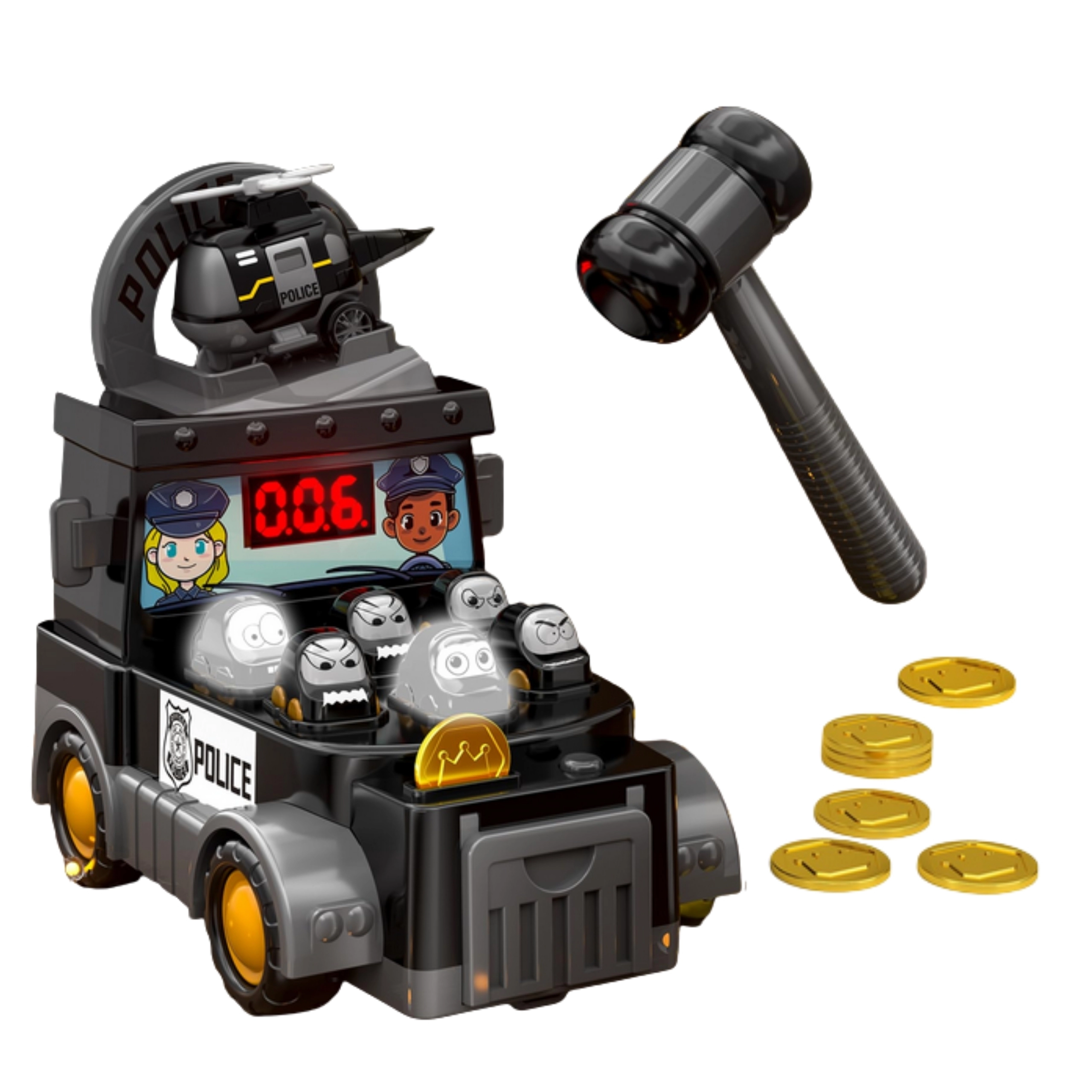 Polizei-Mini-Auto, Helikopter, Hammer, 6 Münzen, Polizeiwagen mit Öffnungen