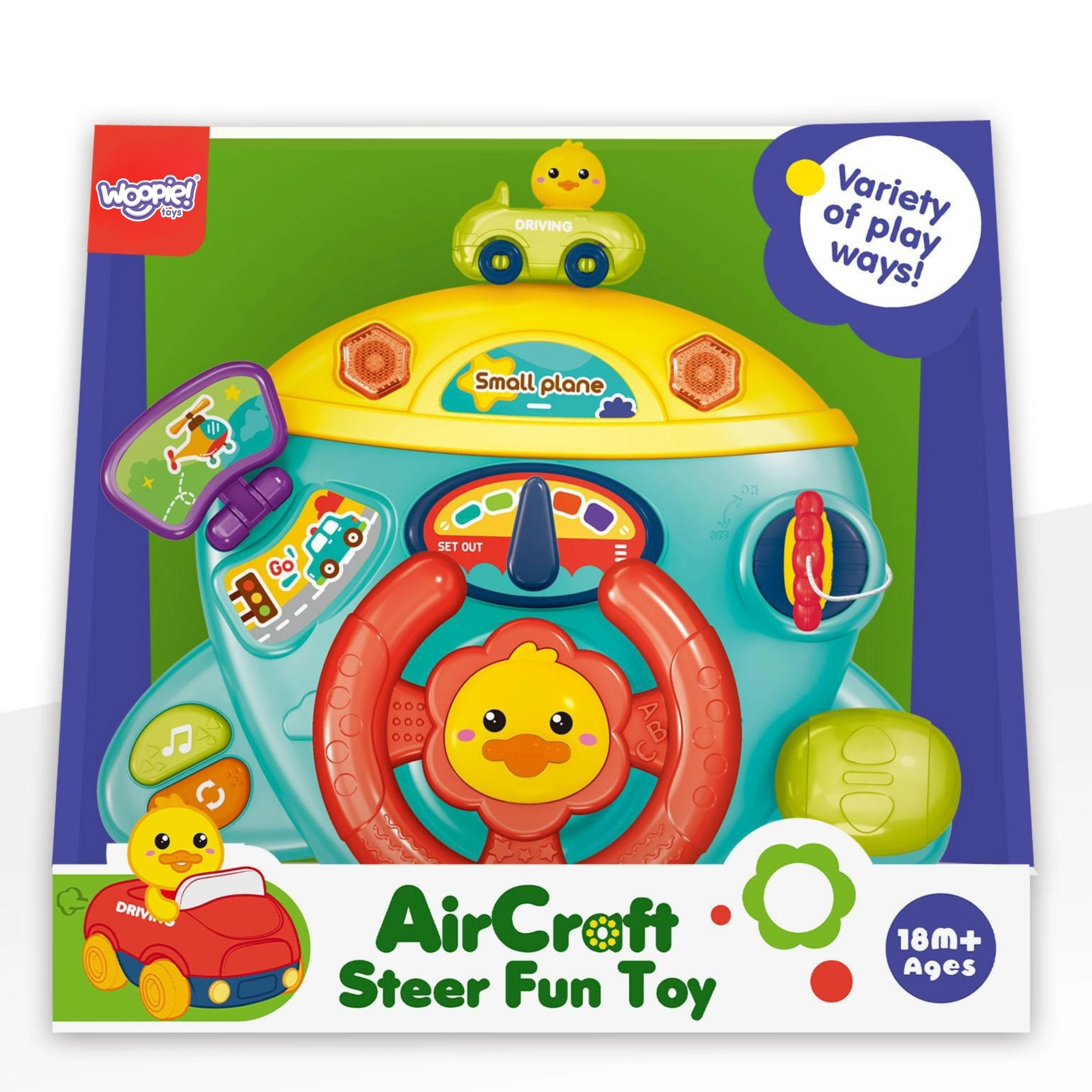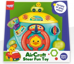 Kleine Piloten können das Enten-Lenkrad drehen, mit dem Schlüssel starten, den beweglichen Tacho und den Spiegel beobachten, während sich das Fahrzeug auf der Oberseite des Flugzeugs auf der Schiene nach links und rechts bewegt. Das Spielzeug unterstützt die Entwicklung der Feinmotorik, der sensorischen Wahrnehmung und das Lernen von Ursache-Wirkungs-Zusammenhängen.