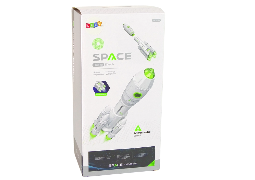 Diese detailreich gestaltete Weltraumrakete besteht aus zwei Teilen: der oberen Steuerstation mit öffnenden Türen und beleuchtetem Cockpit für die Astronautenfigur sowie der unteren Stufe mit vier Triebwerken, die während des Countdowns einen Raucheffekt (Wasserdampf) erzeugen und dem Spiel Spannung und Realismus verleihen.