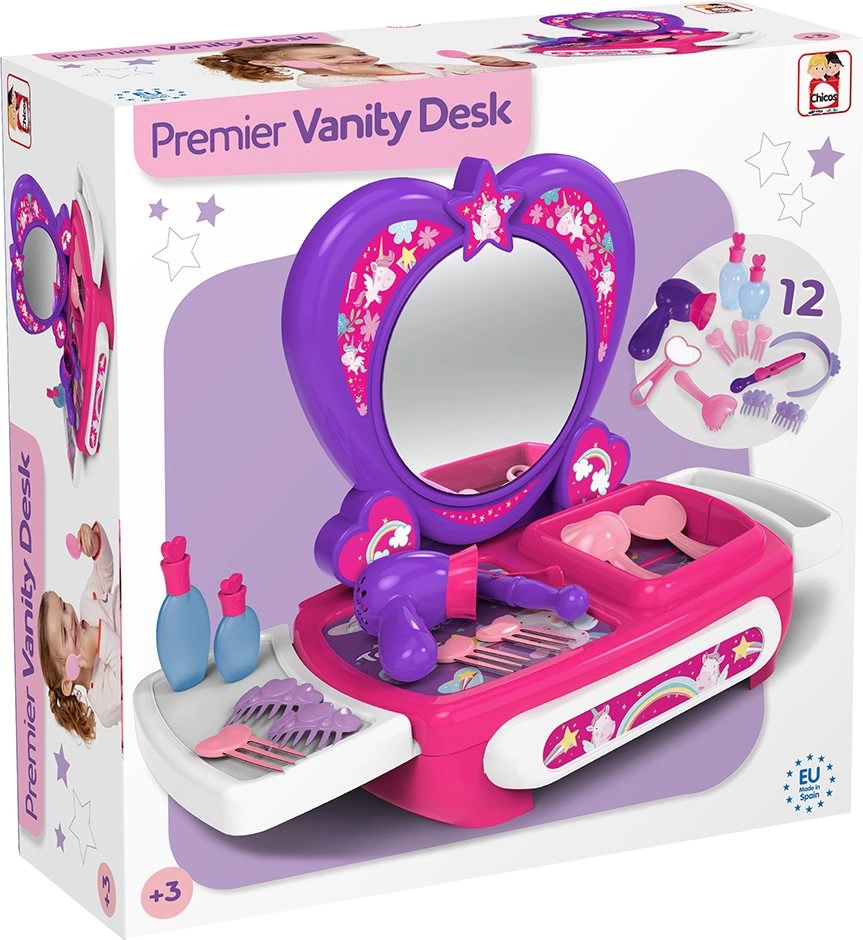 Schenken Sie Kindern eine Welt der Fantasie und des Rollenspiels mit diesem zauberhaften Kosmetiktisch – ideal zum Kämmen, „Schminken“ und Pflegen der Haare. Dank des großen Spiegels und des übersichtlichen Stauraums sind alle Accessoires stets griffbereit.