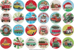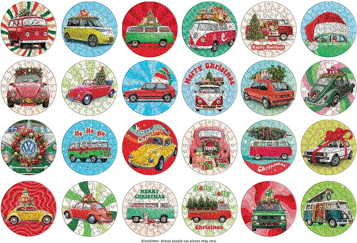 Dieser EUROGRAPHICS-Adventskalender bietet tägliche Portionen Spaß und Festtagsstimmung. Hinter jedem der 24 Türchen verbirgt sich ein neues Mini-Puzzle mit retro Weihnachtsmotiven von VW – von Bussen voller Geschenke bis zu stilvollen Autos mit Weihnachtsbäumen. Die fertigen Bilder sind etwa 12,7 × 12,7 cm groß und eignen sich hervorragend als Dekoration.