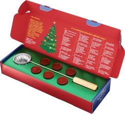 Alles Nötige ist sofort zur Hand – die Wachs-Münzen schmelzen schnell, und die spezielle Kelle erleichtert das sichere Eingießen in kaltes Wasser. Die entstandenen Formen können Sie anschließend gemeinsam deuten und so ein originelles festliches Programm genießen.