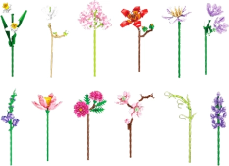 Sie können zwischen Varianten mit 87 bis 227 Teilen wählen und so den Schwierigkeitsgrad Ihrer Erfahrung anpassen. Nach dem Aufbau entstehen Modelle mit einer Höhe von etwa 25–32 cm, die einzeln ausgestellt oder zu einem originellen Strauß kombiniert werden können. Kompatible Verbinder ermöglichen das Kombinieren mit anderen Bausets und das Erweitern der Sammlung.