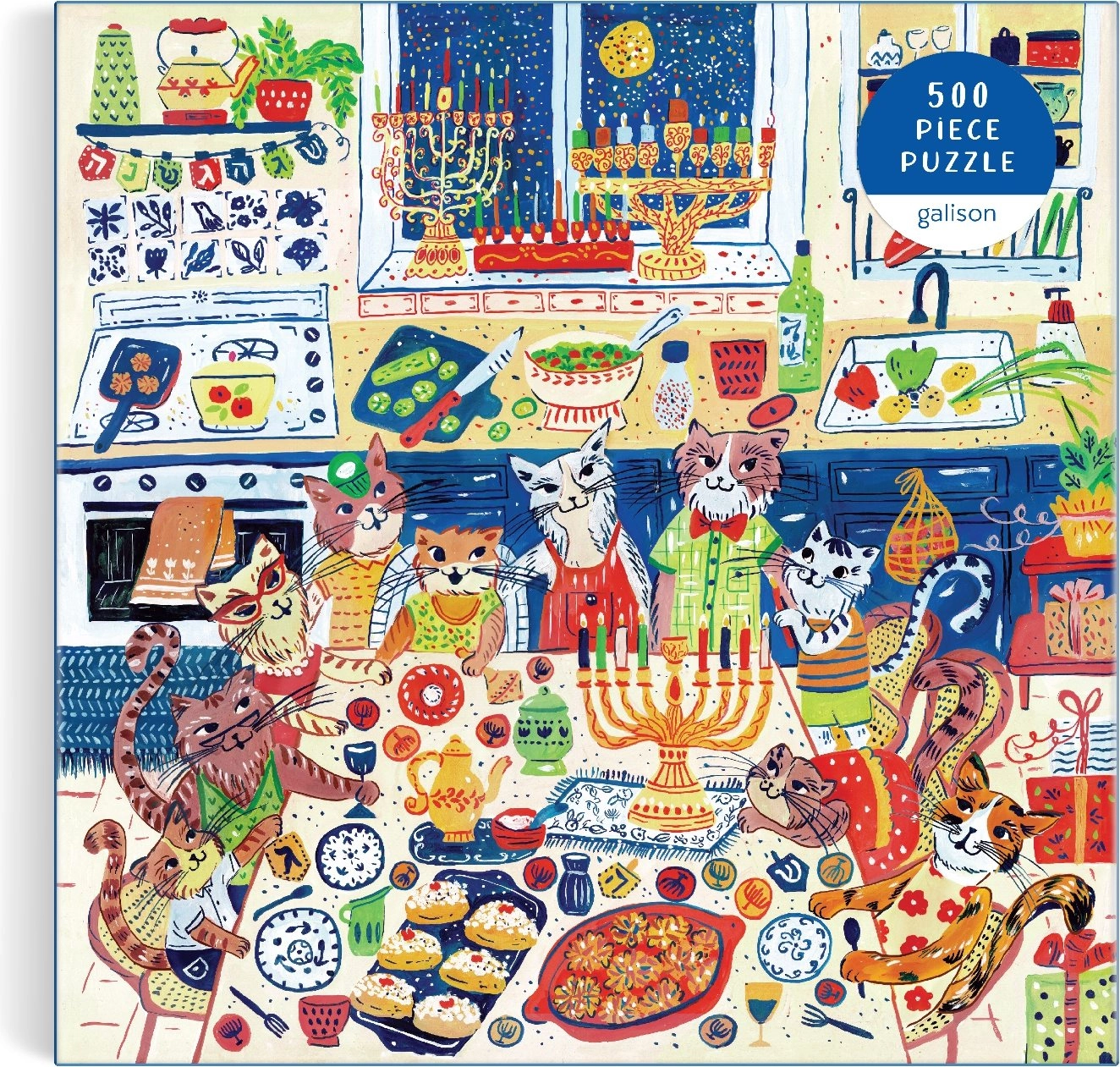 Das quadratische Puzzle Happy Hanukcats zeigt eine verspielte Illustration voller Katzen und festlicher Hanukkah-Dekoration. Dank des Formats 51 × 51 cm und 500 präzise gestanzten Teilen ist es eine hervorragende Wahl für ein mittelschweres Puzzlevergnügen, das Kinder wie Erwachsene begeistert.