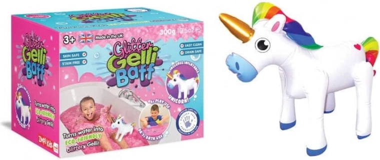 Ebenfalls im Set enthalten ist ein niedliches aufblasbares Einhorn, das die magische Atmosphäre perfekt abrundet. Das Produkt ist biologisch abbaubar zertifiziert, leicht abwaschbar und färbt weder Haut noch Badewanne.