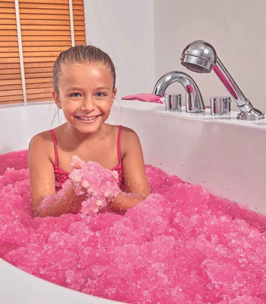 Einfach das Pulver in die Badewanne streuen und im Handumdrehen entsteht ein rosa, glitzerndes Gelly, das Kinder lieben. Sinnliches Spiel, das Kreativität und Feinmotorik fördert.