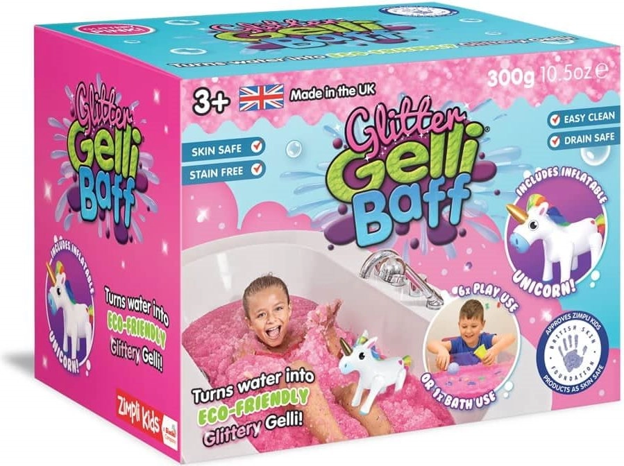 Glitter Gelli Baff bietet Kindern sensorischen Spielspaß in und außerhalb der Badewanne. Innerhalb weniger Minuten verwandelt sich das Wasser in ein dickes, rosa und glitzerndes Gelly, das ungiftig, frei von schädlichen Chemikalien und dermatologisch verträglich ist. Nach dem Spiel den beiliegenden Auflöser hinzufügen – das Gelly wird wieder zu Wasser, das sicher abgelassen werden kann.