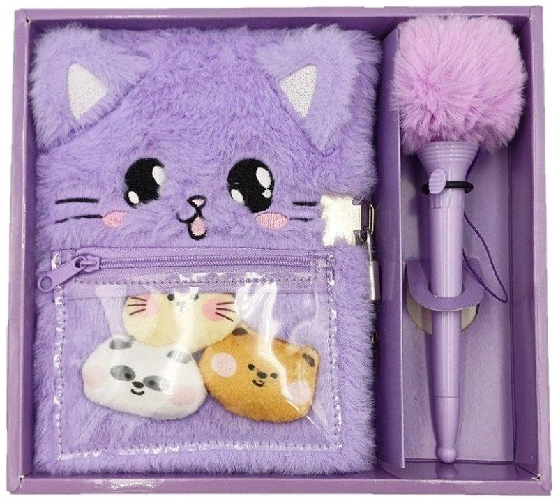 Die praktische Einschubtasche birgt kleine Plüschspielzeuge, die jedes Schreiben versüßen. Der spezielle Kugelschreiber mit Auslösemechanismus und Pompon verleiht dem Schreiben einen spielerischen Funken – einfach drücken und der Spaß kann beginnen.