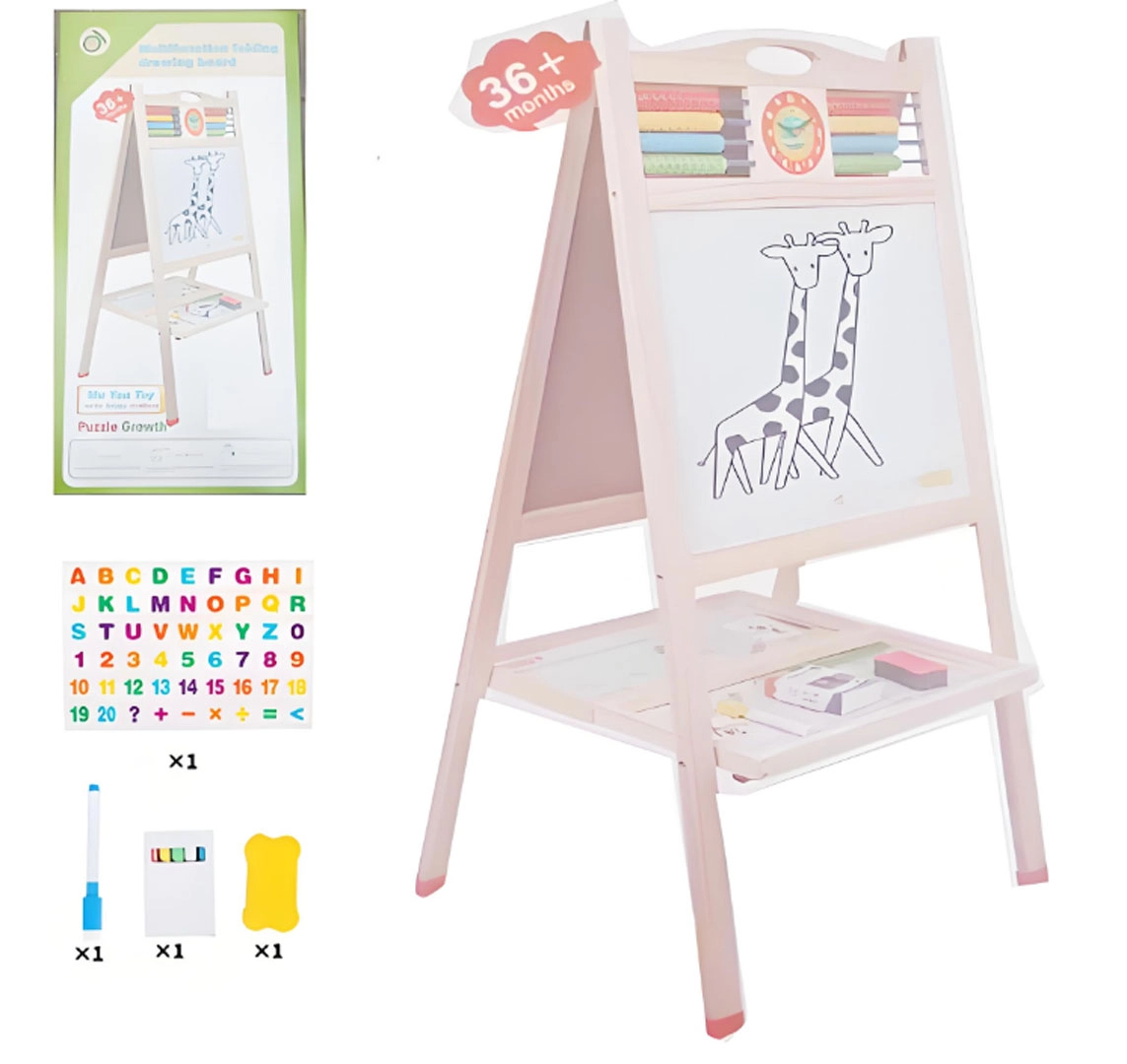 Im oberen Bereich finden Sie einen Abakus und eine Uhr mit verstellbaren Zeigern für einfaches Lernen von Mathematik und Zeit. Die Tafel lässt sich leicht aufstellen ganz ohne aufwendige Montage und ist sofort einsatzbereit.