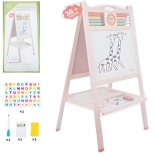 Diese hochwertige Holztafel ist ideal für kreatives Spiel und erste schulische Fertigkeiten. Die doppelseitige Ausführung ermöglicht Schreiben mit Marker auf der weißen Magnetseite und Zeichnen mit Kreide auf der anderen Seite. Ein praktisches Ablagefach für Zubehör hält alles griffbereit, und die stabile Holzkonstruktion sorgt für sicheres Spielen.