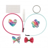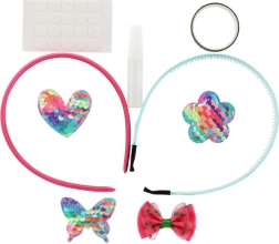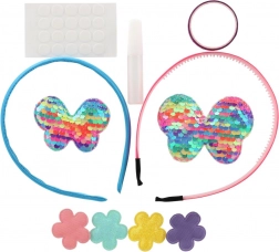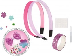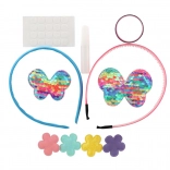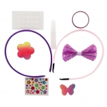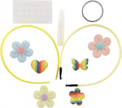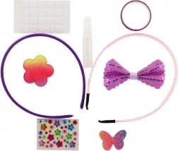 Zwei Kunststoff-Haarreifen, selbstklebende Punkte, ein kleiner Kleber und viele Dekorationen – von glitzernden Applikationen bis zu Steinchen. Einfach öffnen und losdekorieren.