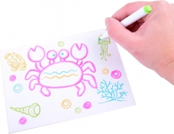 Im Set enthalten sind 4 fluoreszierende Stifte, beidseitige Schablonen mit Meeresmotiven, eine 3D-Brille und ein Reinigungstuch. Die glatte Oberfläche des Boards ist leicht zu reinigen – ideal für wiederholte Nutzung und tägliches Kreativsein ohne Chaos.