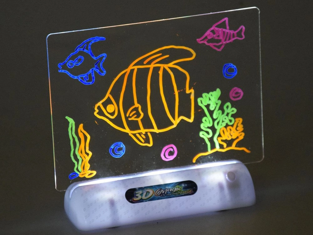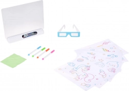 Dieses magische 3D-Zeichenbrett verwandelt jede Idee in ein leuchtendes Bild. Kinder können frei zeichnen oder die beiliegenden Schablonen nachfahren – mit aufgesetzter 3D-Brille „erwachen“ die Bilder zum Leben und erhalten einen faszinierenden räumlichen Effekt. Die LED-Beleuchtung betont die Neonfarben und macht das Kunstwerk sogar zu einer originellen Nachtlampe.