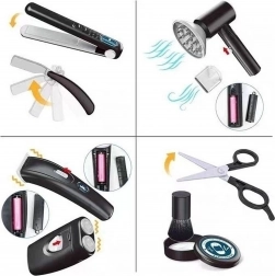 • Umfangreiche Ausstattung, 24 Teile: Aufsätze, Scheren, Kämme, Glätteisen, Spiegel, Rasiermesser und mehr.