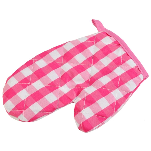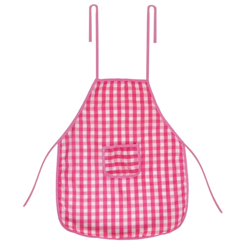 Leichtes rosa‑weißes Karo mit Bindung am Nacken und an der Taille sorgt für bequemen Sitz. Die praktische Tasche hält kleine Küchenhelfer griffbereit.