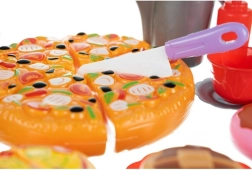 Die Pizzastücke sind mit Klett verbunden – Kinder können sie mit dem Kunststoffmesser teilen und wieder zusammensetzen. Realistisches Spiel ohne Unordnung fördert die Feinmotorik.