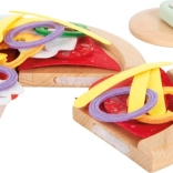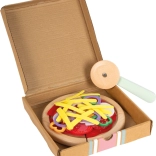 Segmentierte Pizza mit abnehmbaren Belägen und Unterlage – bereit zum Spielen und Servieren; alles lässt sich übersichtlich in der Schachtel verstauen.