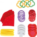 Filz-Toppings wie Zwiebeln, Pilze, Paprika, Tomaten, Wurst und Käse fördern Kreativität und Lernen durch Spiel.