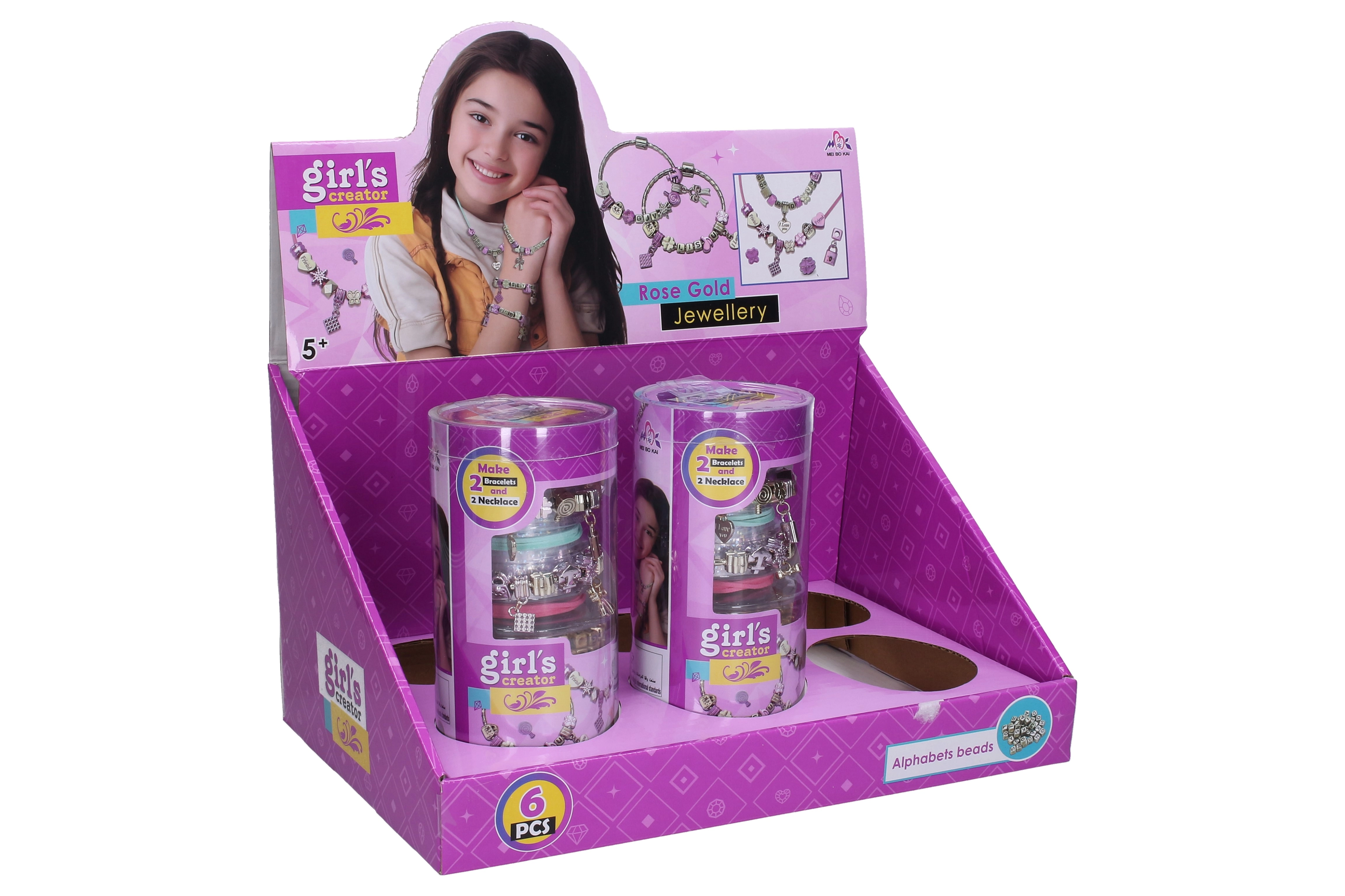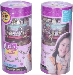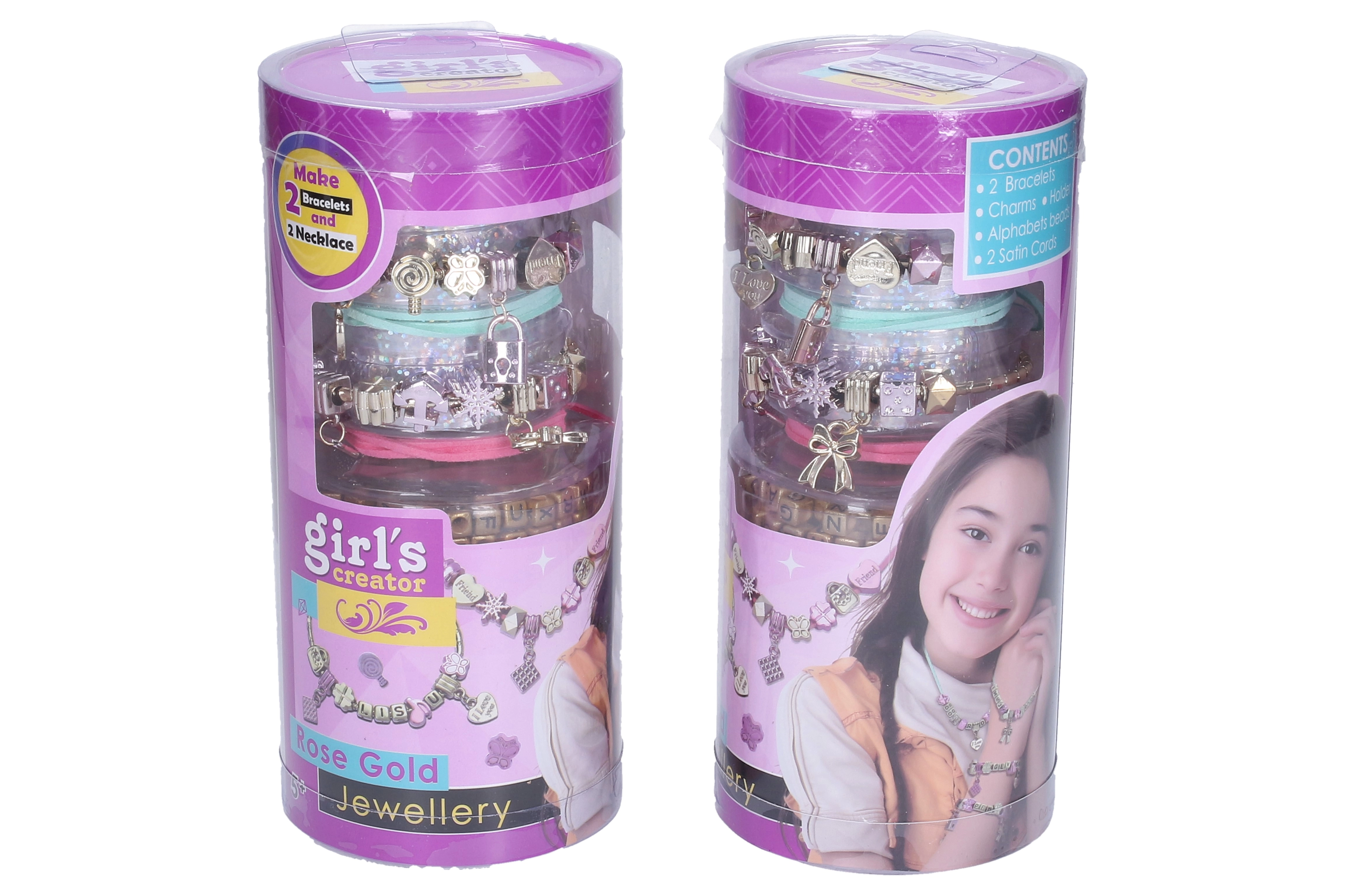 Dieses Kreativset begeistert alle kleinen Schmuckdesignerinnen. In der Verpackung finden Sie alles, was Sie zur Herstellung stylischer Armbänder und Halsketten im eleganten Roségold-Ton benötigen – von Anhängern in Herz-, Stern- und Schleifenform bis hin zu Buchstabenperlen für Namen und Botschaften.