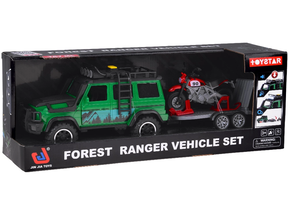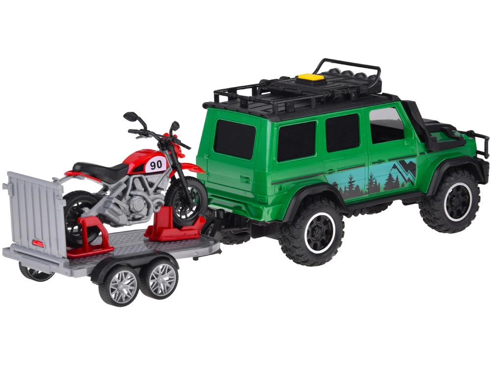 Auf ins Gelände! Dieses detailreiche Set kombiniert ein grünes SUV mit robusten Reifen und Dachgepäckträger mit einem praktischen Anhänger für den Motorradtransport. Realistische Licht- und Soundeffekte sorgen für Atmosphäre, während öffnende Vordertüren und drehbare Gummiräder für viel Spielspaß und sanfte Bewegung auf dem Boden sorgen.